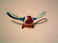 「のどのところはね。言葉とか表現を現わすんですが」同じくピンクで縦長のだ円が“く”の字にまがったような模様がついた。